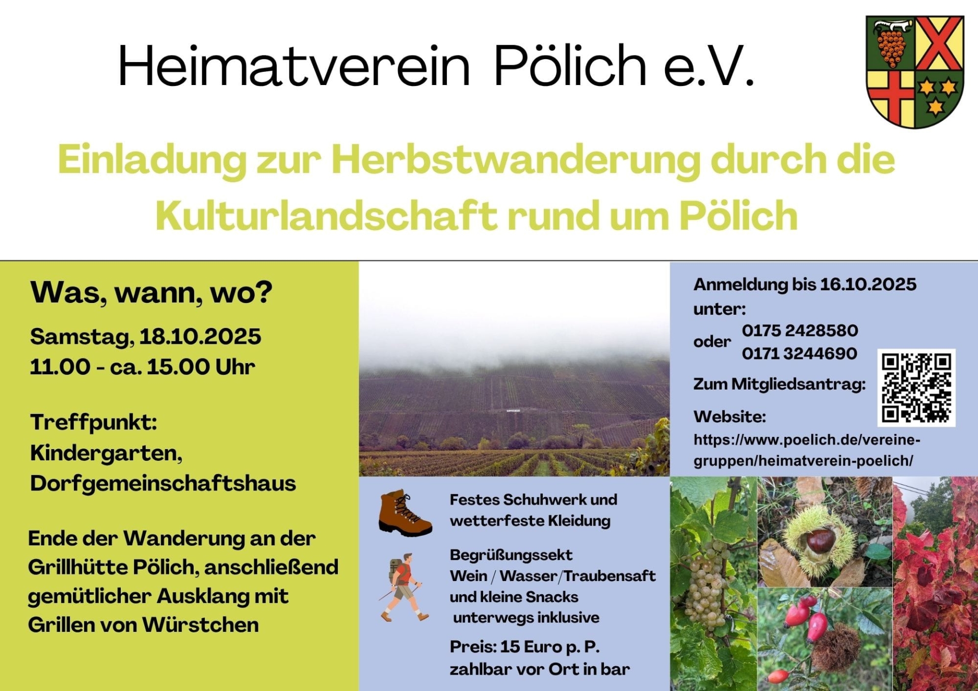 Die Herbstwanderung des Heimatvereins ist dieses Jahr am 18.10.2025 und startet um 11:00 Uhr am Dorfgemeinschaftshaus/ vorm Alten Gewölbekeller in Pölich. Alle Bürgerinnen und Bürger sind zu dieser Wanderung herzlich eingeladen. Preis: 15€ p.P.
