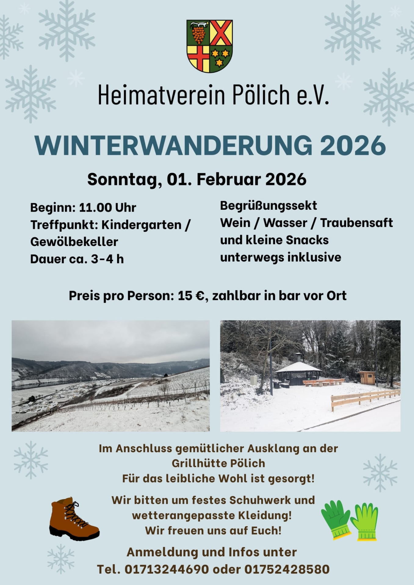 Die Winterwanderung des Heimatvereins findet am 31. Januar 2027 statt. Treffpunkt ist um 11.00 Uhr am Alten Gewölbekeller / Kindergarten, Hauptstraße 30, 54340 Pölich.